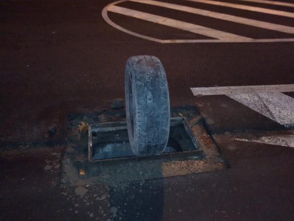 Проте черговий ляп дуже обурив водіїв. Про це написала у мережі Фейсбук мешканка Франківська Роксолана Кравчук. Франківчанка виставила в мережі фото на яких видно, що замість стічних решіток колодязі прикрили колесами.