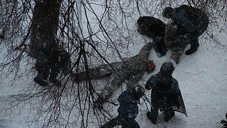 Тіло загиблого знаходиться у медчастині на Грушевського, яку розгорнули в одній з будівель.
