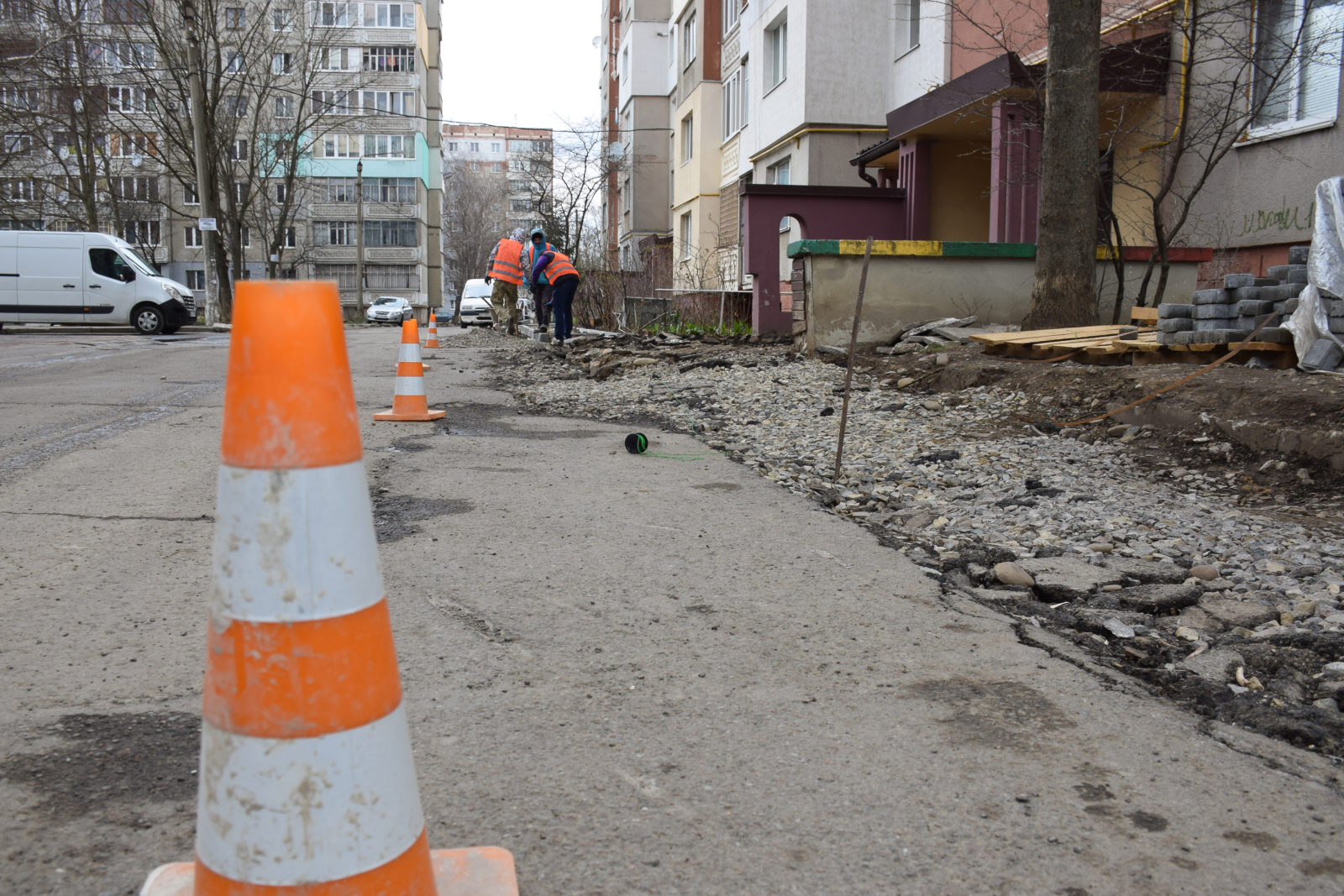 У дворі навпроти біля будинку №12 роботи лиш почались. За проектом тут облаштують нові тротуари, перекладуть дощівку та відновлять дорожнє полотно. Асфальтування розпочнуть приблизно в травні, коли погода Двір за двором:сприятиме цьому.