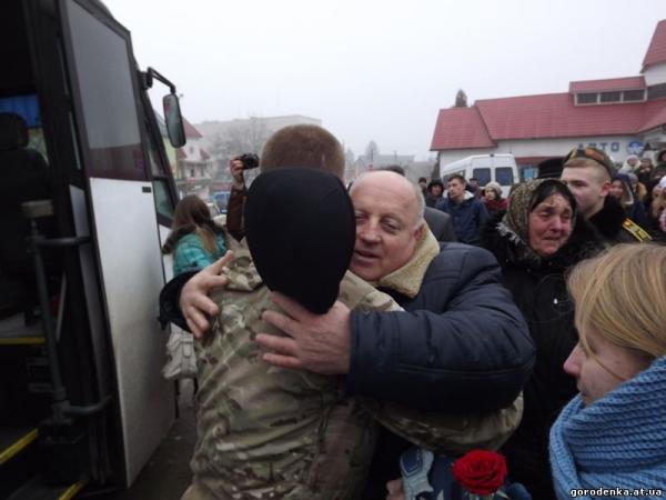 Перші хвилини перебування на рідній землі, що дихає материнським теплом, запахом весни, усмішок чарівних юних панянок райцентру були зворушливі для молодого бійця Української Армії. Під вигуками "Слава Герою!" гімназистки та керівник району Василь Буджак вручили Володимиру квіти.