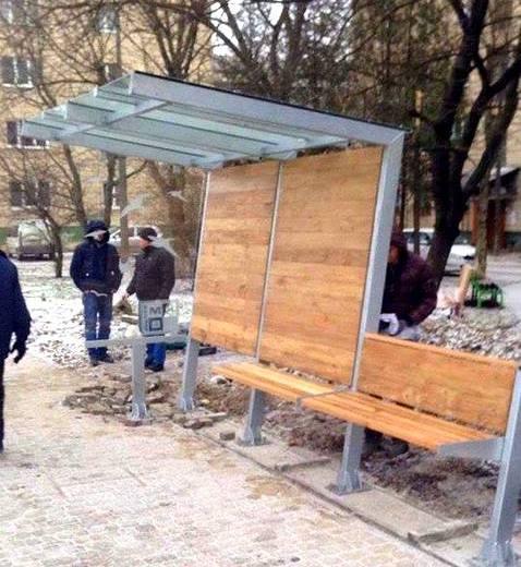 Дана зупинка нового зразка виконана з металу, дерева, скла - основних матеріалів сучасних архітектурних форм.