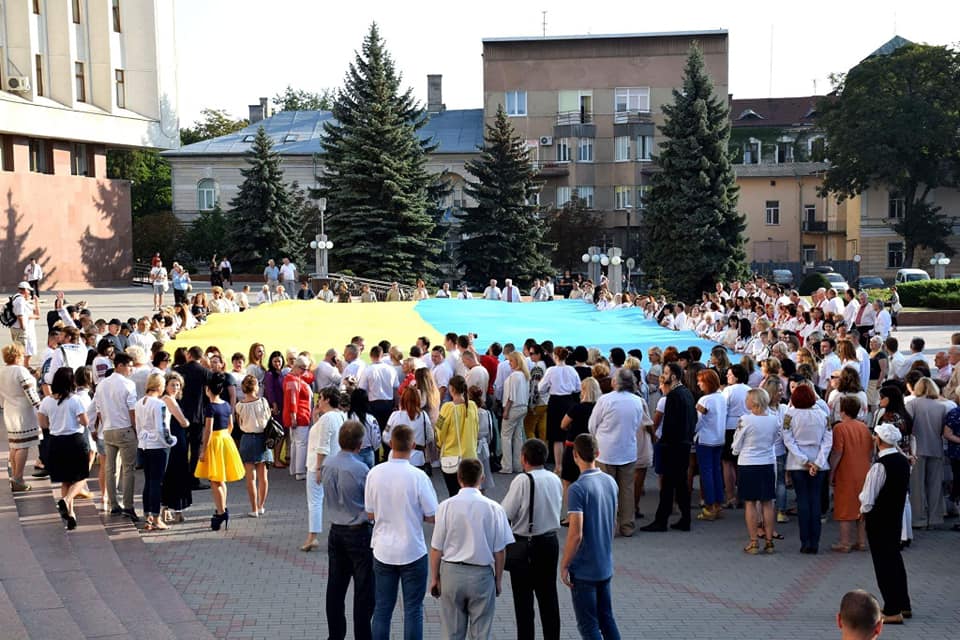 На площі перед ОДА франківці розгорнули великий синьо-жовтий прапор довжиною 36 метрів. Про це йдеться на сторінці міського голови Івано-Франківська Руслана Марцінківа у соцмережі Facebook.
