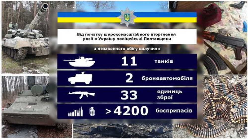 За 30 діб широкомасштабної війни росії проти України поліція Полтавщини вилучила з незаконного обігу понад 30 одиниць різноманітної зброї та воєнну техніку.