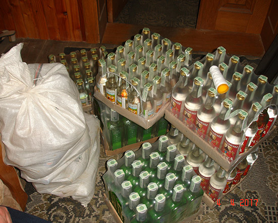 Зокрема, вилучено понад 1500 пляшок фальсифікованої горілки з підробленими марками акцизного збору, понад 300 літрів фальсифікованого коньяку, а також понад 400 літрів спирту, близько 2000 підроблених марок акцизного збору, наліпки на пляшки для горілки одного з місцевих виробників, корки, закаточні ключі та велику кількість підготовленої тари для розливу фальсифікату.