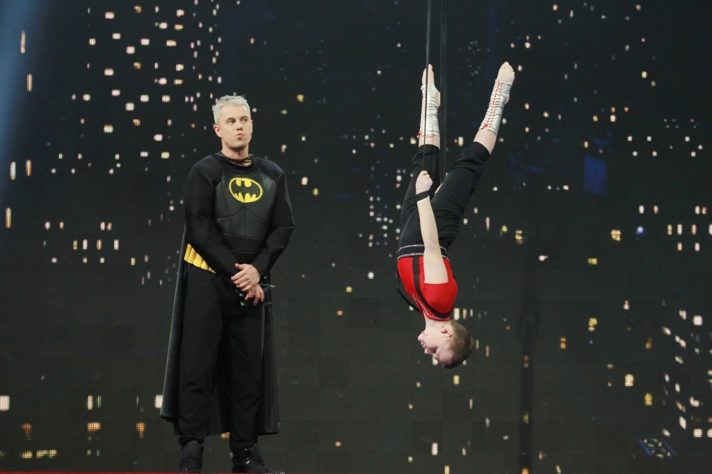 Зробити з Андрія Доманського Бетмена? Легко! Відправити його в епічний політ над сценою? Запросто! 10-річний цирковий акробат Ілля Міхєєв труднощів не боїться. Цей хлопчик з пелюшок ріс за лаштунками цирку. І в шість років вже точно знав: найскладніший вид акробатики - трюки на ременях. І це - його доля!