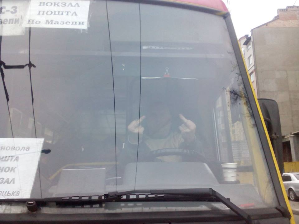 Під час фотографування номера автобусу, шофер ще й показав пресі свої середні пальці. Після цього він таки мало не переїхав працівників “Галки” – врятувало лише те, що люди самі фактично вискочили з-під маршрутки.