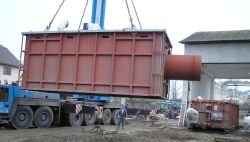 У другій половині дня до котельні доставлено котел, вага якого 22 тонни. Він має розташуватися всередині новозбудованого приміщення. Двоповерхові стіни котельні є, а даху – нема, адже котел буде подаватися зверху. У цій операції беруть участь обидва потужні крани. Котел транспортувався в лежачому стані, а його слід змонтувати в котельні вертикально. Великовантажний кран спеціальними шлеями підіймає котел. Другий кран підтримує знизу. І ось багатотонна конструкція зависає в повітрі. Ще мить… і котел над стінами новозбудованої котельні. Кранівник не бачить, куди має стати котел, проте чіткі команди монтажників - і 22-тонна конструкція вже стоїть на призначеному фундаменті – міліметраж!. Чітко і досконало.