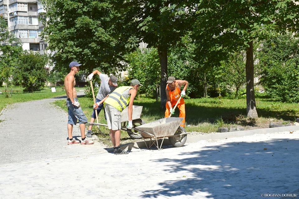 Тут минулого року облаштували мережу брукованих доріжок, встановили зручні лавки та смітники. Зараз ремонтники викладають бруківкою міжбудинковий проїзд. Про це у мережі Фейсбук повідомив міський голова Руслан Марцінків.