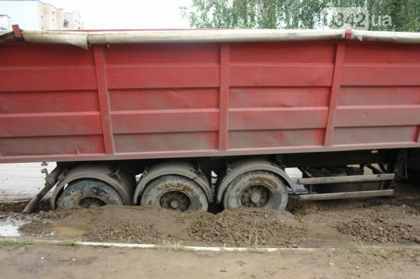У Пасічній, на вулиці Хіміків 18 близько 12.05 години загружена піском фура "DAF" провалилася у яму на дорозі.