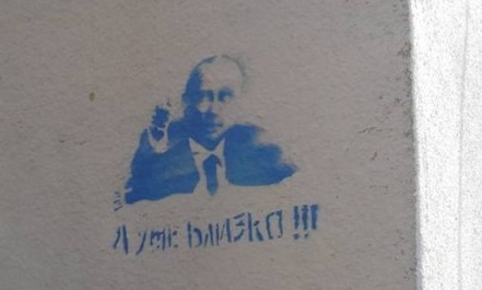 ”Я уже близко!!!”, — пише на трафареті. Одні користувачі соцмереж пропонують знайти горе-”художника”, інші — ”їхати у Москву і малювати Бандеру”, інформують ”Вікна”.
