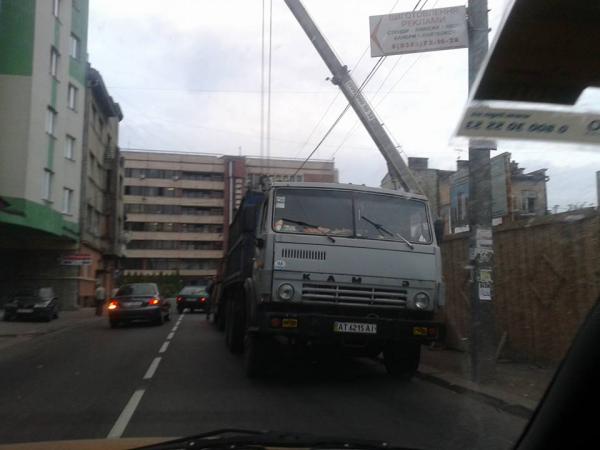 Мешканець Івано-Франківська поскаржився у мережі Фейсбук на водія КАМАЗа, що припаркувався для розвантаження цегли посеред дороги.