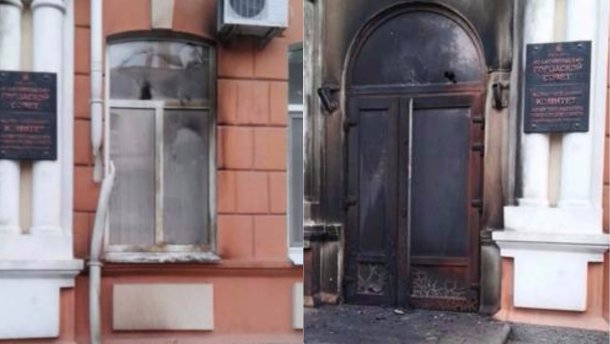 Зокрема, о 3:40 двоє невідомих осіб кинули кілька пляшок із запаленою рідиною у приміщення ради.
