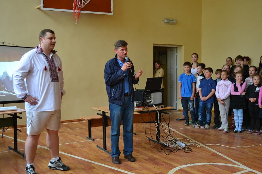 Спортивний зал школи, який два роки тому був капітально відремонтований за сприяння Романа Онуфріїва, зібрав усіх учнів школи.Усі присутні діти були в захваті від побаченого, адже богатир наочно демонстрував свої силові вміння: згинав цвяхи, арматуру, надував грілку та сідав на шпагат. Проте не одними демонстраціями рекордсмен зацікавлював молоде покоління, а пропонував дітворі також взяти участь в цікавих конкурсах. Хлопці на швидкість дмухали кульки, поки ті не луснуть, а дівчата повинні були найдовше проскакати на скакалці. Переможці конкурсів отримали грамоти, книжки «Поради чемпіона», а також подарунки від Романа Онуфріїва.