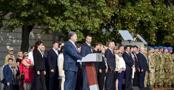 Глава держави повідомив, що сьогодні по завершенні урочистостей, прямо із Святої Софії вирушає до лінії фронту. «Вирушаю, щоб привітати із Днем Державного Прапора і з ювілеєм – 25-ю річницею нашої української Незалежності – тих, хто є головним гарантом нашої свободи, волі, демократії і державної самостійності. Сьогодні відбудеться передача у війська ще однієї величезної партії військової техніки та зброї», - сказав Петро Порошенко.