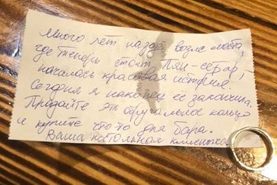 "Багато років тому біля місця, де тепер стоїть "Пян-Се Бар", почалася красива історія. Сьогодні я її нарешті закінчила. Продайте цю обручку і купіть щось для бару".
