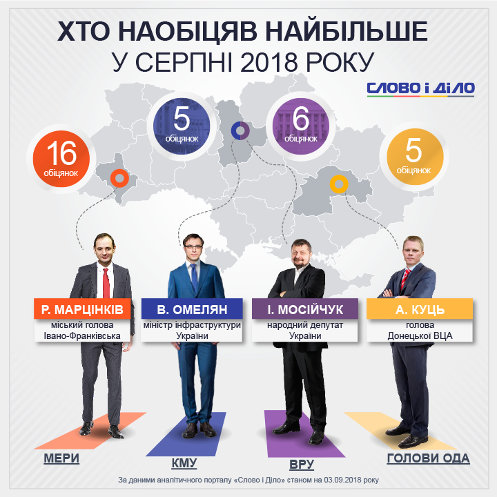 У серпні рекордсменом за обіцянками став мер Івано-Франківська Руслан Марцінків, який дав 16 запевнень, у тому числі збудувати три електрозаправки, а також заборонити продаж алкоголю у вечірні години.