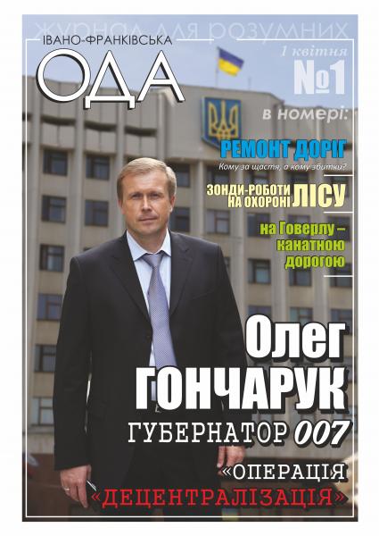Тому не дивно, що на першій сторінці дебютного номеру постав голова ОДА у прототипі Бонда – “губернатор-007″. Така прив’язка має подвійний зміст, адже Гончарук – сьомий голова Івано-Франківської ОДА за часи незалежності України.