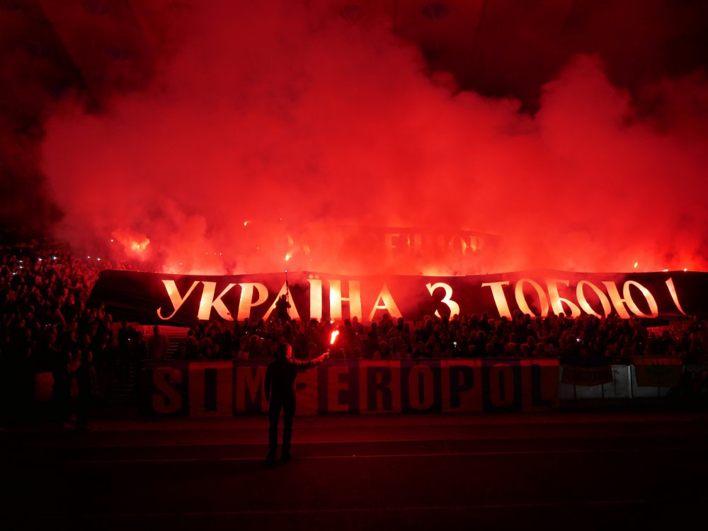 Вивіску підсвітили фаєрами. На двох великих екранах з різних боків стадіону можна було побачити фотографії українських політв'язнів у Росії, пише Gazeta.ua.