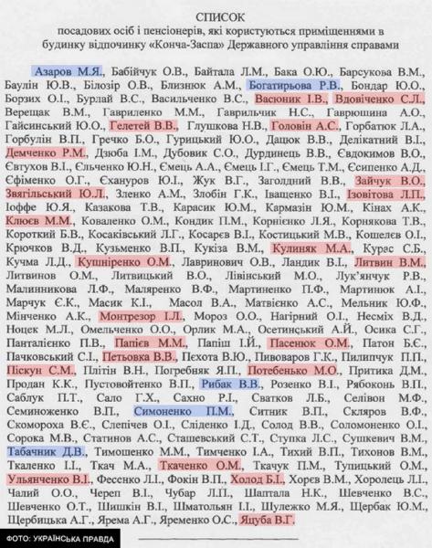 У переліку осіб, які користуються дачами в "Конча-Заспі", ви найдете найодіозніших представників старого режиму – екс-прем'єра Азарова, екс-міністра охорони здоров'я Богатирьову, екс-міністра освіти Табачника, лідера комуністів Симоненка, екс-спікера парламенту Рибака.