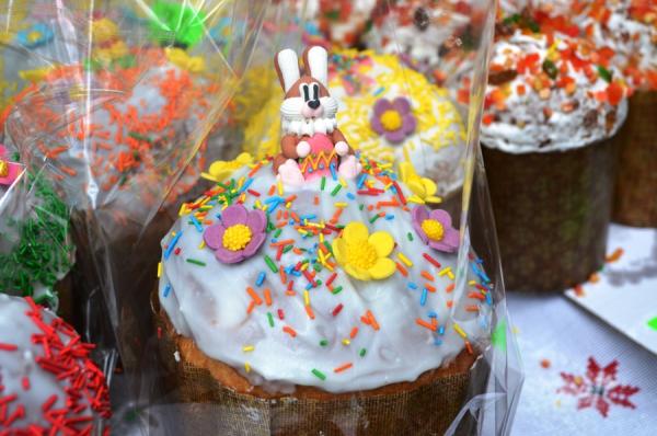 Чого тут тільки немає. Поряд з традиційними пасками милують око яскраві пасочки прикрашені глазур'ю, шоколадом з сухофруктами та пасхальні ягнята. Проте найбільше малень яскраві пасокки привертають увагу дітей ,які рзом з матусями прийшли вибирати головний атрибут свого кошичка.