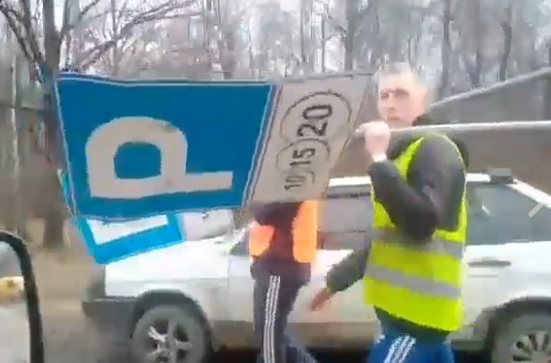 Така кількість автомобілів ,які не платять за парковку не дала спокою двом невідомим чоловікам, які вирішили встановити з двох сторін дороги знаки паркування і збирати гроші з водіїв. По завершенню "робочого" дня паркувальники збирають свою "виносну" парувальну зону і їдуть геть. Підприємливих паркувальників зафіксував на відео Віктор Стручков.