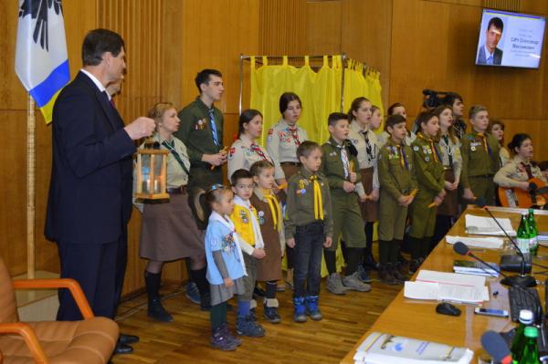 На початку засідання найменші скаути передали голові обласної ради Олександру Сичу запалену лампадку з Вифлиємським вогнем, а тоді всі разом заспівали пісню «Вогонь миру», інформує кореспондент Бліц-Інфо.