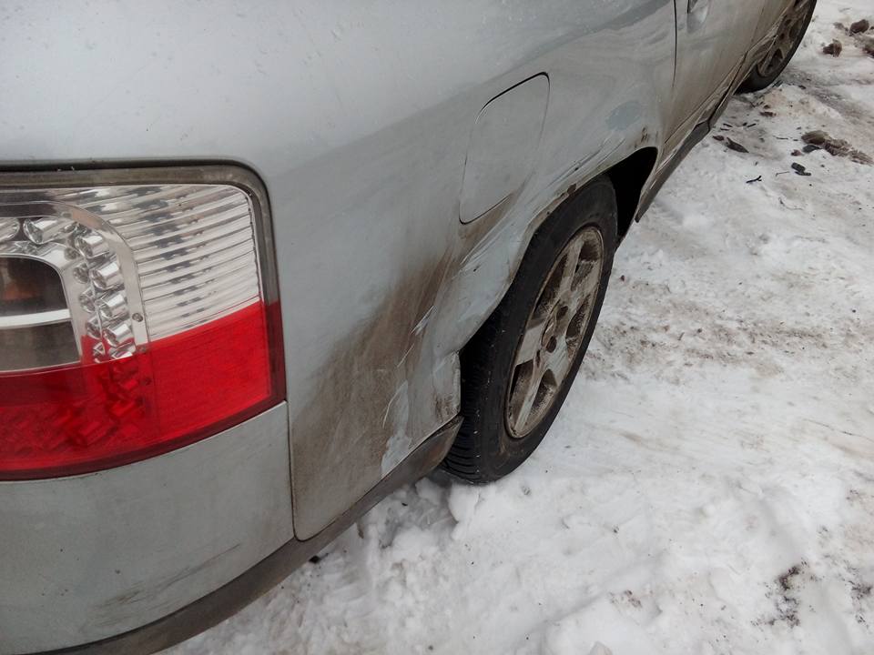 "Вночі в період з 23-00 по 7-30 ранку моє авто Ауді А6, що було припарковане на вуличній парківці в Івано-Франківську на вул. Височана навпроти 29 буд. вдарило інше авто та втекло з місця ДТП. Удар сильний, бо моє авто розвернуло. По залишкам деталей - то Ауді чи Фольцваген сріблястого кольору. Удар, скоріш за все, зроблений переднім бампером, яким протягнув по всьому правому боці - від заднього крила до переднього. Водій міг залишити контакт, та нанесені мені збитки відшкодувала б страхова по полісу цивільноі відповідальності... Та не склалося(( Буду вдячний за інфо свідків або хтось бачив авто Ауді чи Фольцваген із свіжопобитим бампером. За суттєву допомогу - винагорода!", - написав водій.