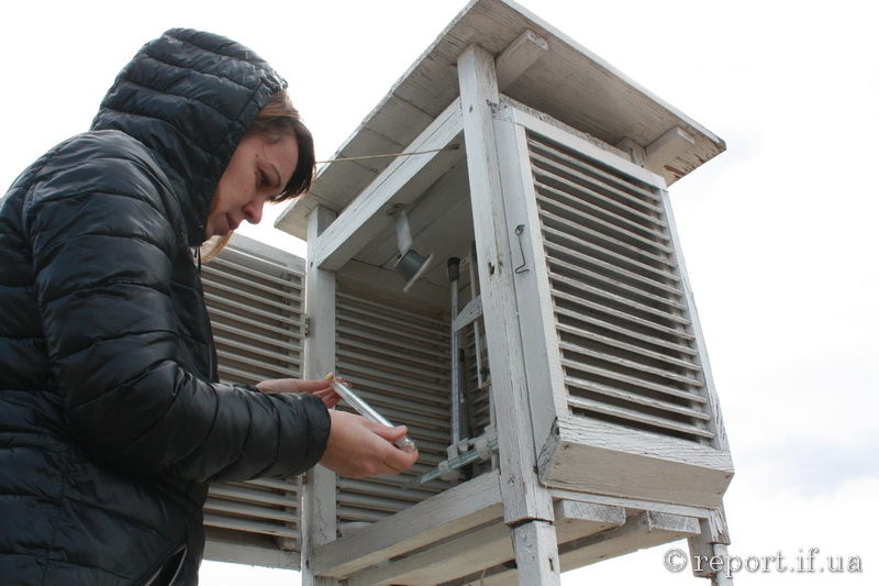 «Так ми вимірюємо температуру повітря. Часом нам дзвонять люди і скаржаться — бач, передана погода не відповідає тому, що показує термометр у них на сьомому поверсі в місті. А вона й не має відповідати. Ми вимірюємо температуру за міжнародними стандартами — у психометричній будці, в полі і на два метри від землі», — каже Вікторія Калашник