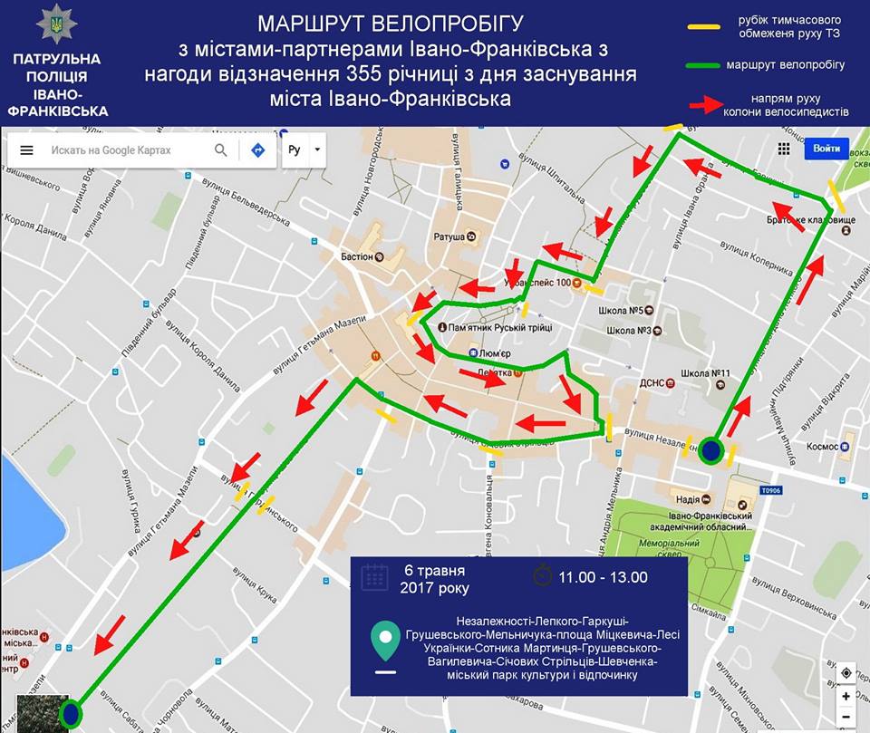 6 травня 2017 року відбудеться велопробіг з містами-партнерами Івано-Франківська з нагоди відзначення 355 річниці з дня заснування міста Івано-Франківська. Задля безпеки його учасників патрульна поліція Івано-Франківська з 11.00 год. до 13.00 год. тимчасово обмежить рух транспортних засобів згідно з маршрутом велопробігу (вул. Незалежності – вул. Лепкого – вул. Гаркуші - вул. Грушевського - вул. Мельничука - площа Міцкевича - вул. Лесі Українки - вул. Сотника Мартинця - вул. Грушевського – вул. Вагилевича – вул. Січових Стрільців – вул. Шевченка – міський парк культури і відпочинку ім. Т. Шевченка).