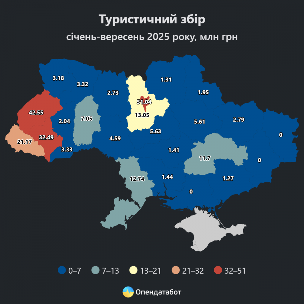 За дев’ять місяців 2025 року місцеві бюджети України отримали 234,4 млн грн туристичного збору, що на 36% більше, ніж торік, і у півтора раза більше, ніж до початку повномасштабної війни.