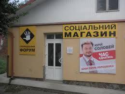 В одному із райцентрів Прикарпаття діє продуктовий магазин на фасаді якого була вивіска із назвою «Соціальний магазин» та агітаційним плакатом одного із кандидатів в народні депутати.