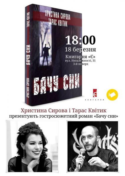 Книгарня «Є» спільно з видавництвом «Крок» запрошують на презентацію гостросюжетного роману Христини Сирової та Тараса Квітика «Бачу сни», що відбудеться в п’ятницю, 18 березня. Початок – о 18:00.