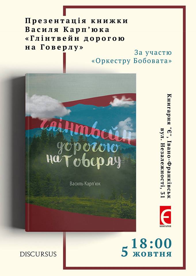Книгарня «Є» і видавництво «Discursus» запрошують на презентацію поетичної книги Василя Карп’юка «Глінтвейн дорогою на Говерлу» за участю автора. Спеціальні гості «Оркестр Бобовата».