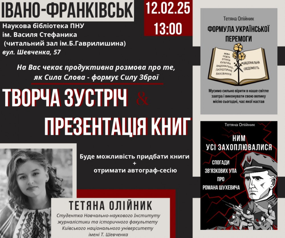 12 лютого о 13:00 год у Науковій бібліотеці ПНУ ім. Василя Стефаника (читальний зал ім. Б. Гаврилишина, вул. Шевченка, 57) відбудеться презентація книг: «Ним усі захоплювалися: спогади зв’язкових УПА про Романа Шухевича»; «Формула Української Перемоги».