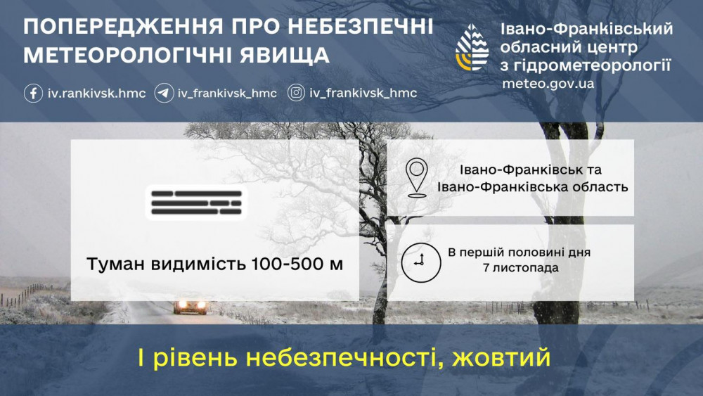За прогнозом Івано-Франківського обласного центру з гідрометеорології, у пʼяницю, 7 листопада на Прикарпатті утримається сильний туман.