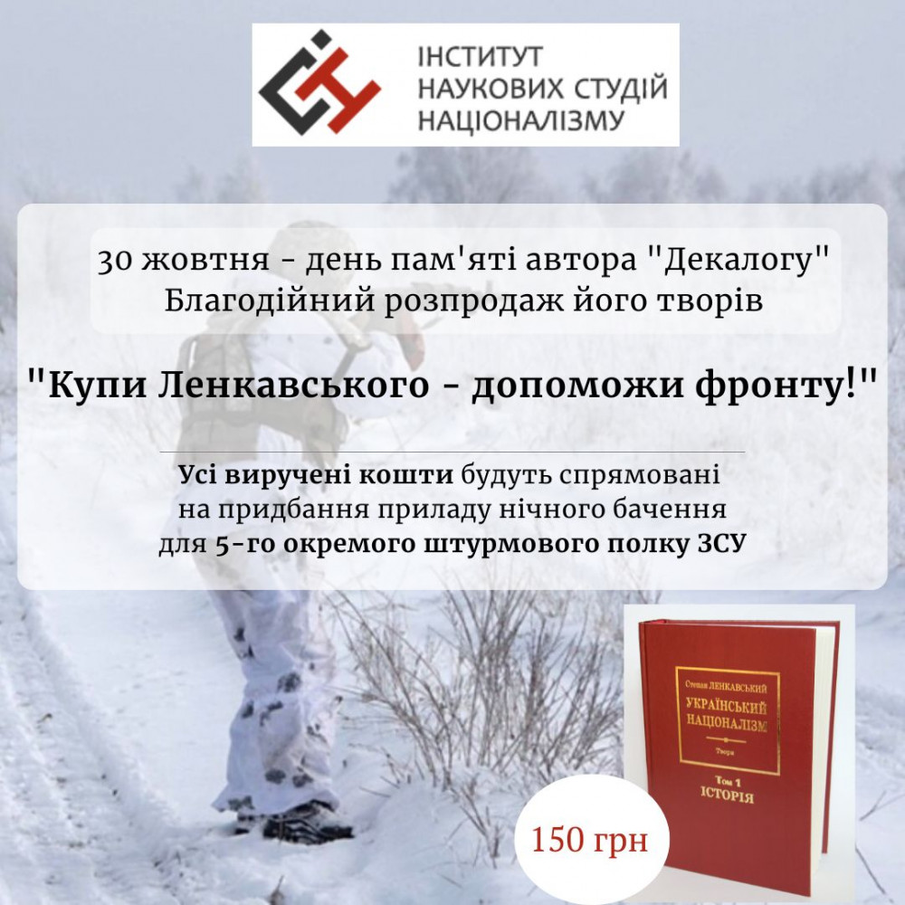 Інститут Наукових Студій Націоналізму організував благодійний розпродаж першого тому книги «Український націоналізм Степана Ленкавського», щоб допомогти фронту.