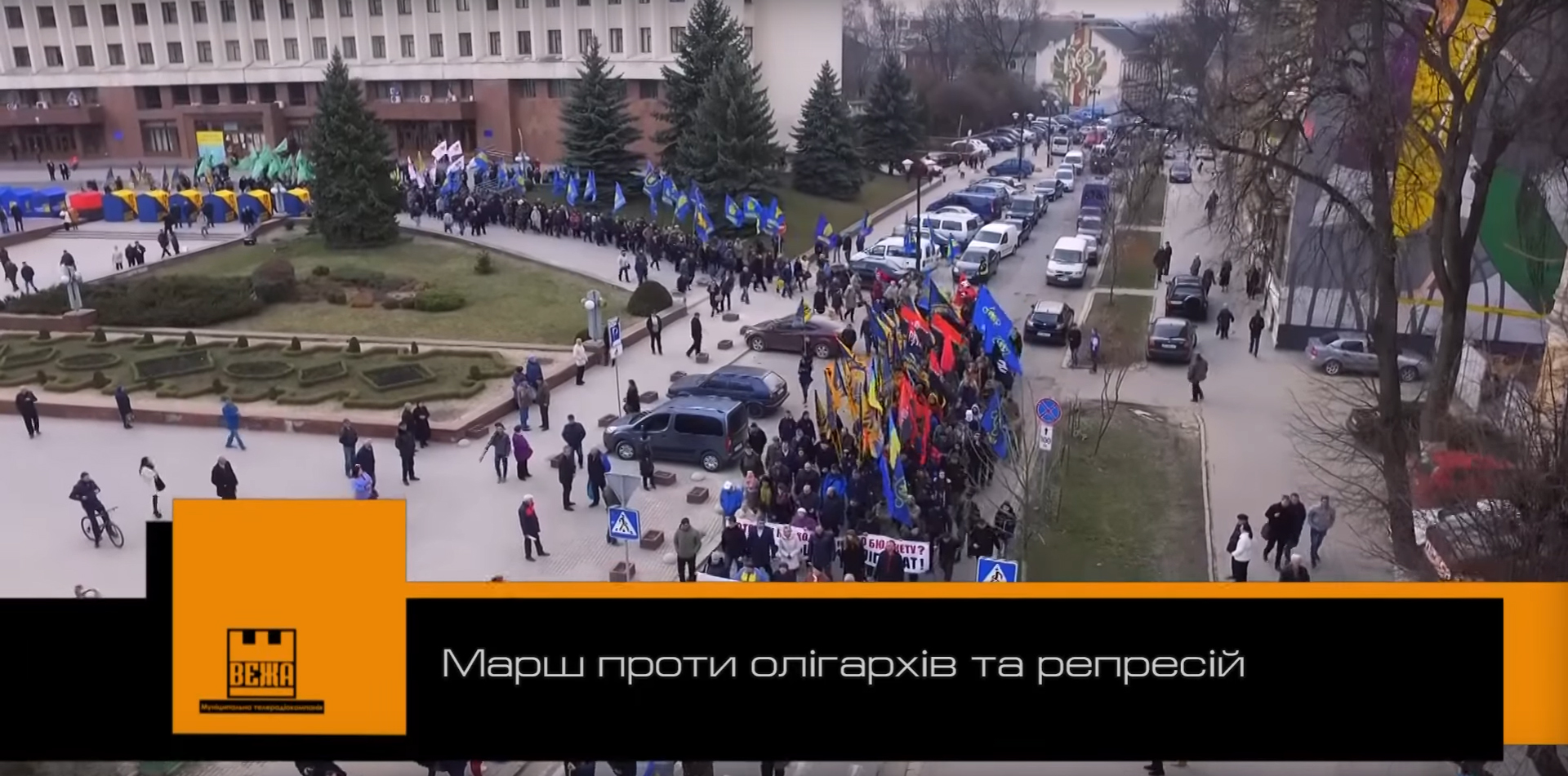 Органузавали марш проукраїнські сили “Свобода”, “Правий сектор” та “Національний копус”. Пояснюють, об’єдналися, аби спільно протистояти владі олігархічих кланів. Вигукуючи патріотичні гасла і заклики учасники маршу підійшли під стіни УБЕЗу. Окрема вимога – зупинити діяльність нелегального бізнесу. А ще масовий вивіз лісу-кругляка. Тут мітингувальники залишили портрети олігархів.