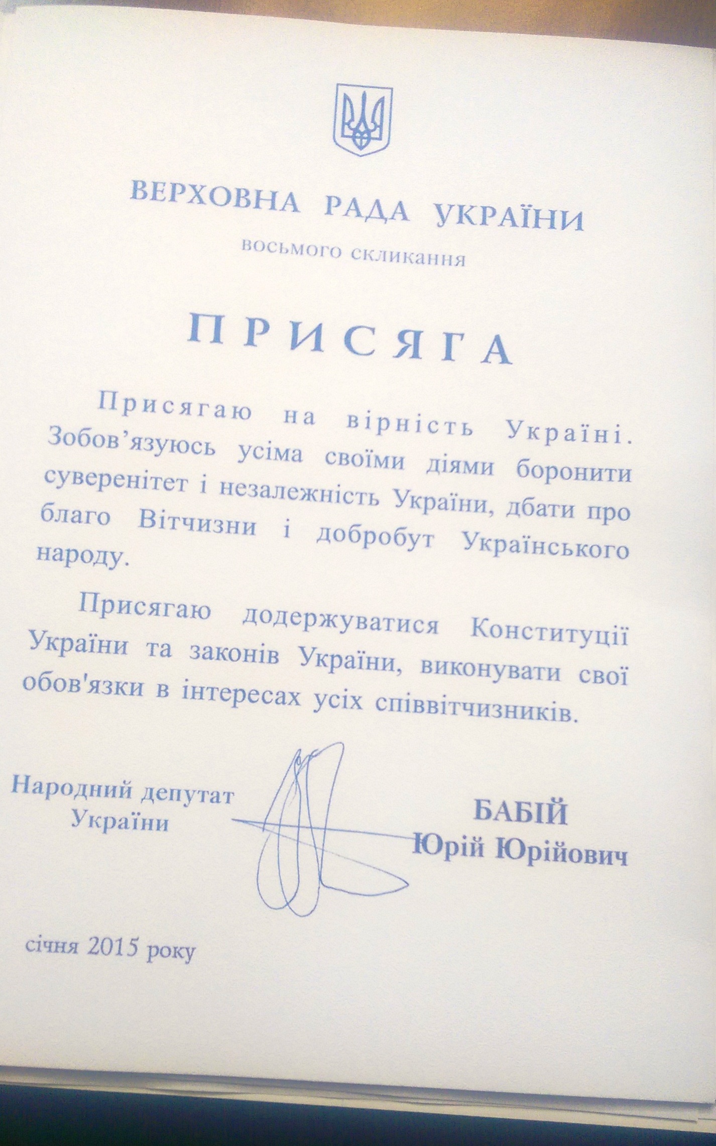 Присягу на вірність Україні Юрій Бабій прочитав з трибуни парламенту у вівторок, 27 січня, на позачерговому засіданні Верховної Ради VIII скликання. Він став четвертим представником Прикарпаття від політсили «Народний Фронт» у найвищому законодавчому органі держави.