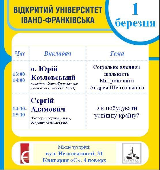 У суботу, 1 лютого, о 13 год. в приміщенні культурно-мистецького центру «Є» в рамках проекту «Відкритий університет» відбудеться зустріч з отцем Юрієм Козловським (лекція «Соціальне вчення і діяльність митрополита Андрея Шептицького) і доктором історичних наук, депутатом облради Сергієм Адамовичем (лекція «Як побудувати успішну країну?»).