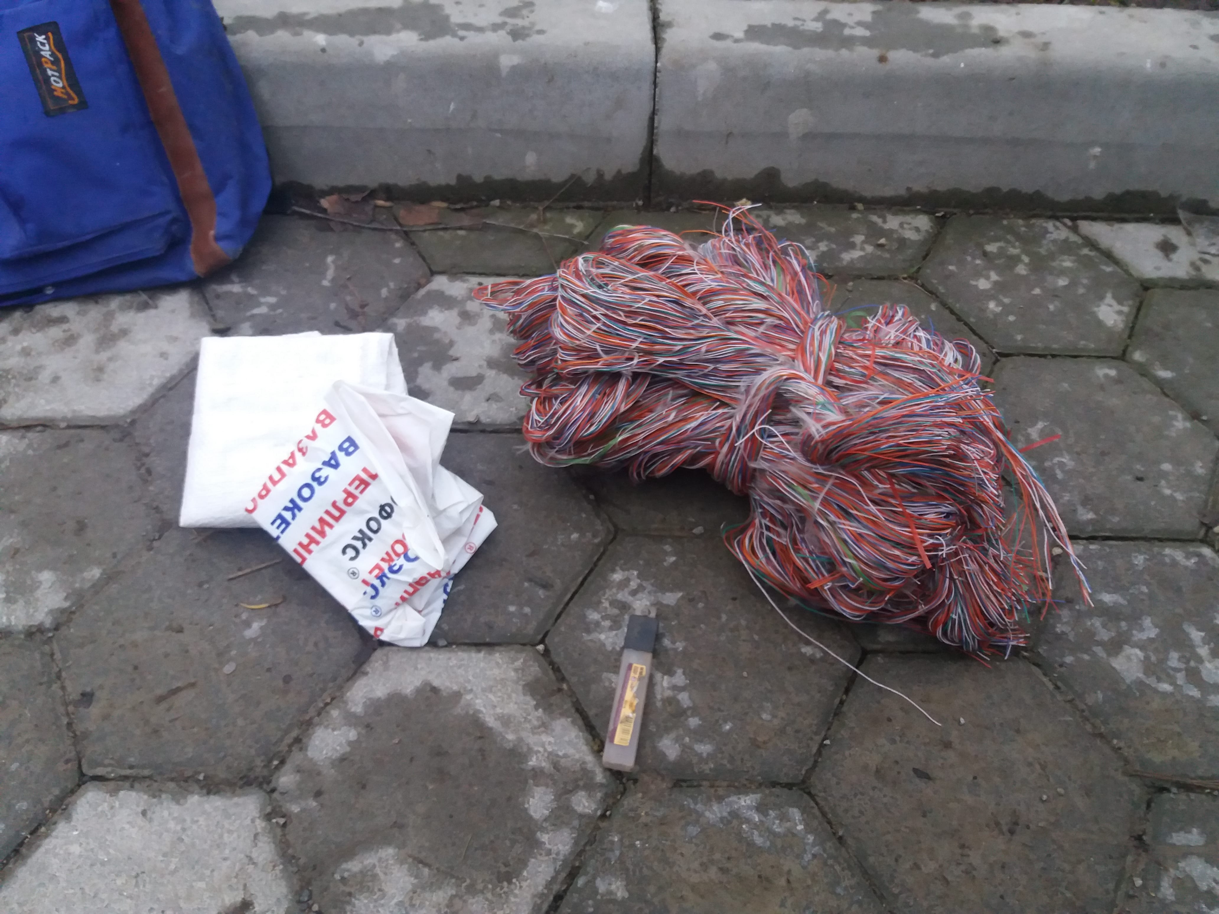 Під час поверхового огляду в затриманого було виявлено рюкзак, в якому знаходився скручений кабель та мішок, а при обстеженні підвального приміщення – пошкодження телефонного кабеля в двох місцях та плоскогубці.