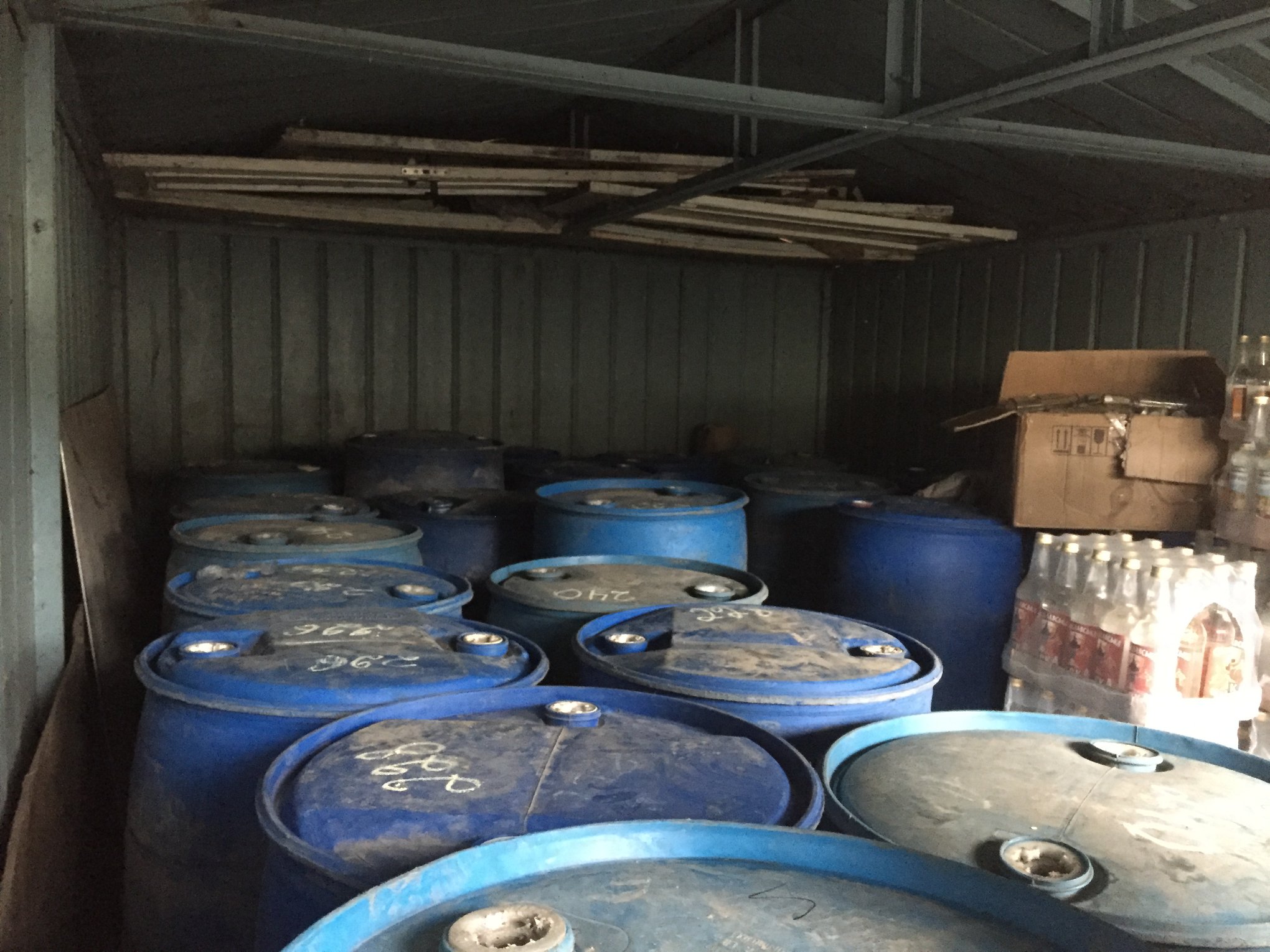 За результатами огляду вказаного приміщення, проведеного з добровільної згоди особи, яка ним користується, з незаконного обігу вилучено 540 літрів алкогольних напоїв різних торгових марок, розлитих у скляні пляшки ємністю 0,5 літра кожна, 5 тис. 580 літрів спирту, розлитого в поліетиленові бочки, комплектуючі для виготовлення незаконної продукції (картонні піддони, металеві корки типу горло-гвинт, порожні пляшки, поліетиленова плівка), а також 2,5 тис. пачок тютюнових виробів.