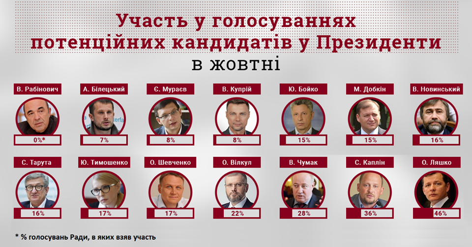 У жовтні вони пропустили понад 80% голосувань парламенту: В. Рабінович не проголосував жодного разу місяць, А. Білецький взяв участь лище в 7% голосувань, Є. Мураєв – 8%, В. Купрій – 8%, Ю. Бойко – 15%, М. Добкін – 15%, В. Новинський – 16%, С. Тарута – 16%, Ю. Тимошенко – 17%, О. Шевченко – 17%. Про це інформує Бліц-Інфо з посиланням на КВУ.