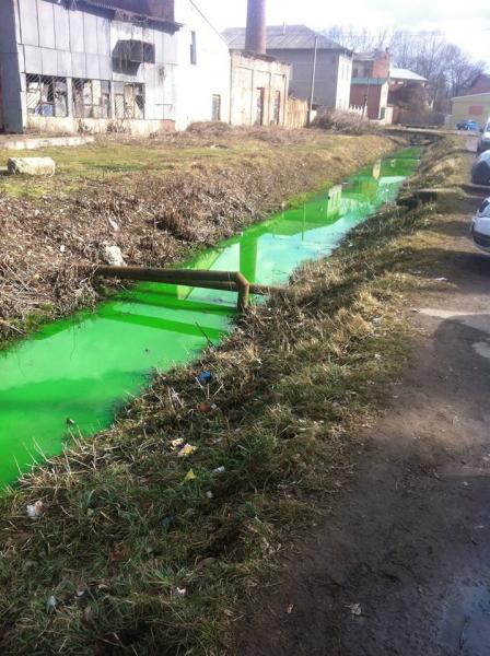 Вода у річці Млинівка, що в Коломиї набула неприроднього кислотно-салатового кольору.