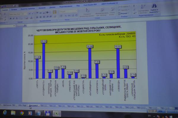 Тож з врахуванням цих зведена таблиця виглядає наступним чином: БПП "Солідарність" - 20,34%, Батьківщина - 16,66%, "Свобода" - 15,97%, "УКРОП" - 11, 26%, "Самопоміч" - 7,93%, "Воля" - 5,39%,
