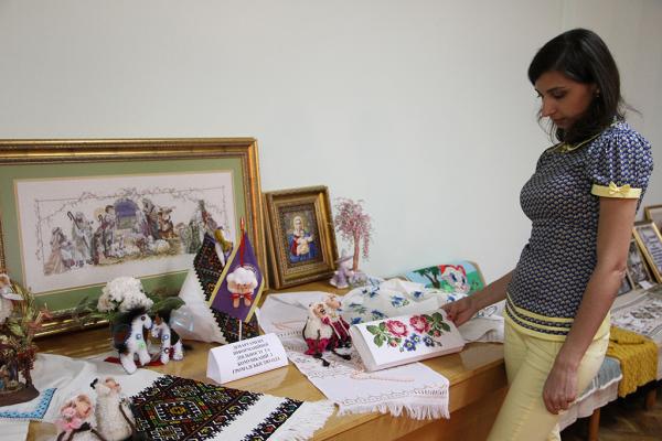 Цього разу на виставці представлено вітальні листівки, вишиванки, малюнки, картини з бісеру, декоративний посуд, плетені одяг та взуття, м'які іграшки.