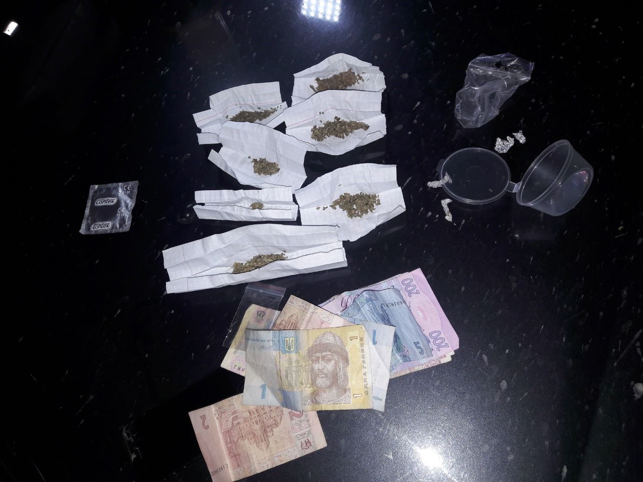 При огляді автомобіля на факт виявлення заборонених речей, у одного із пасажирів, під час проведення поверхневого огляду, в барсетці виявлено 7 паперових згортків, у яких знаходилась подрібнена рослинна речовина, яка за своїми зовнішніми властивостями схожа на наркотичний засіб "марихуану".