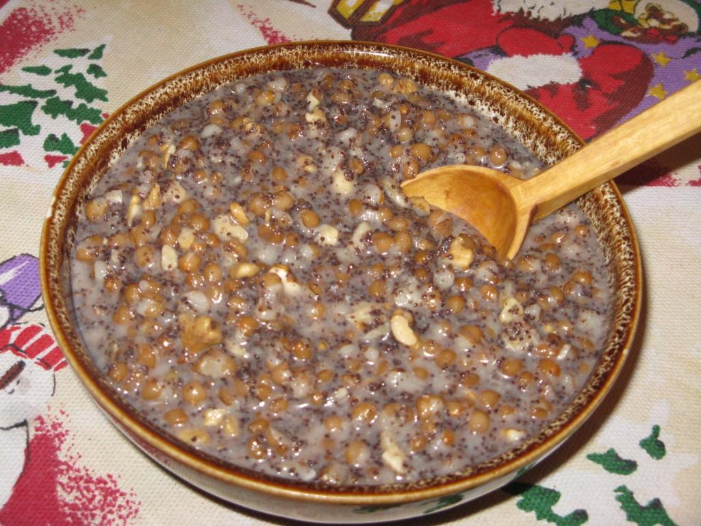 Спочатку маємо очистити від полови зерна пшениці. Зробити це не так вже й просто, але якщо ви справді хочете відчути себе на місці своїх предків, доведеться потрудитися. Для цього потрібні глибока дерев`яна миска або ще краще - ступка, дерев`яний товкач і пшениця. У ступку кладемо жменю зерен пшениці, і як слід, розтираємо їх. Щоб було легше відокремити полову, підливаємо теплу воду в ступку. Після цього необхідно два-три рази промити пшеницю. Заливаємо зерна водою, замочуємо на 2-3 години і варимо на повільному вогні до повної готовності – на це піде не менше 5 годин. Щоб не підгоріло, помішуємо, якщо треба, доливаємо воду. У невеликій ступці чи мисці добре розтираємо макогоном мак - має виділитися молочко з маку. Додаємо до маку мед (якщо зацукрився, трохи треба розігріти з невеликою кількістю води). З з'єднуємо все з готовою пшеницею. Посипаємо зверху посіченими ножем або злегка потовченими у ступці горіхами.