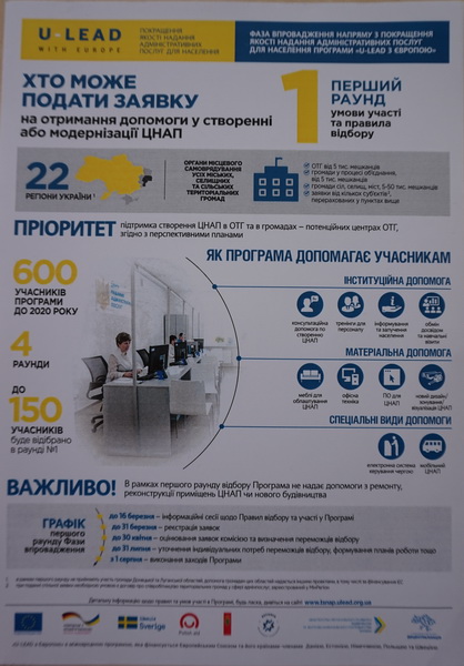 Програма «U-LEAD з Європою» надаватиме відібраним громадам інституційну підтримку та матеріальну допомогу при створенні та модернізації ЦНАПу. Це насамперед, навчання персоналу та закупка меблів, програмного забезпечення і техніки», - зазначив Олег Білоус регіональний спеціаліст Програми «U-LEAD з Європою», другий компонент «Створення ЦНАПів».