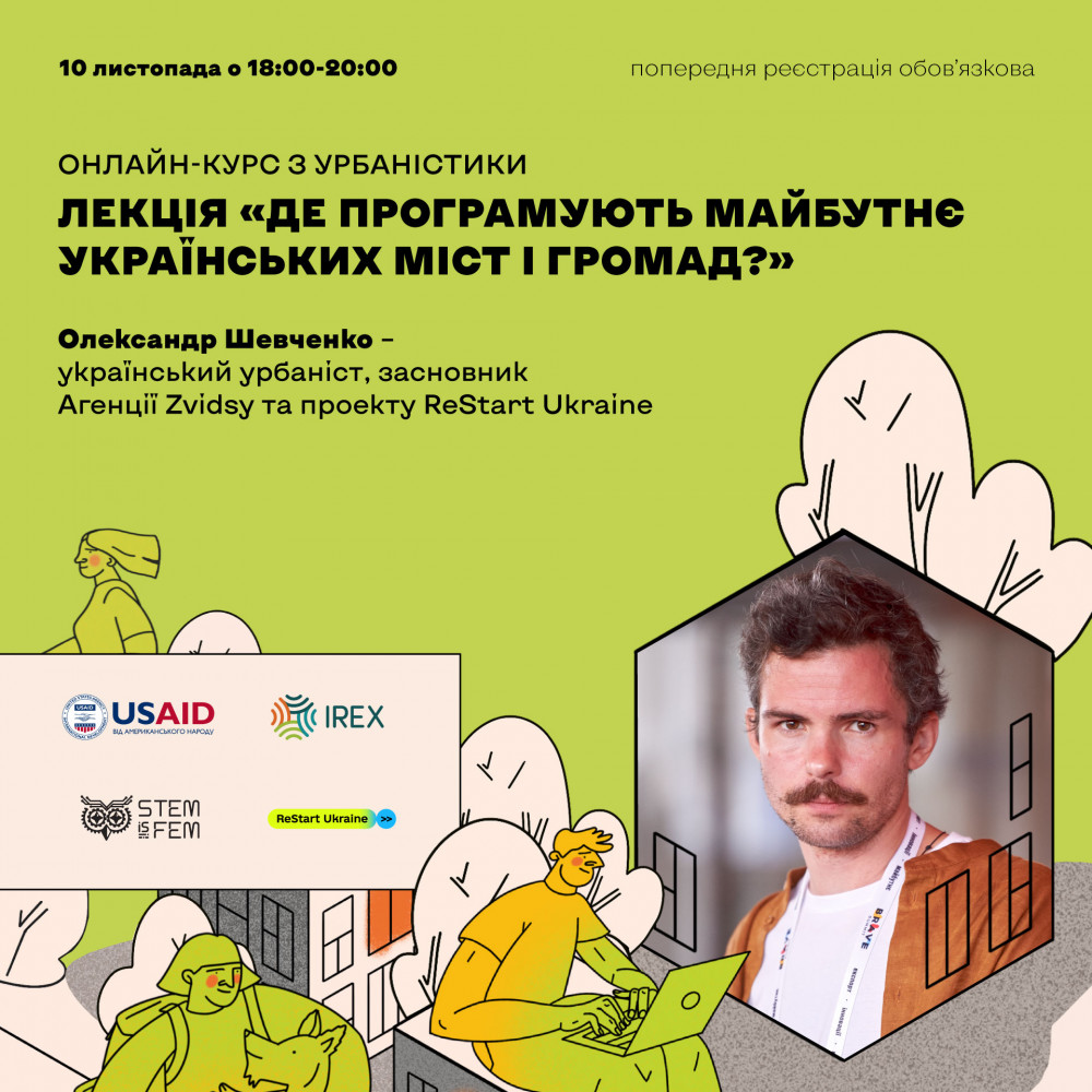 Про те, як варто відбудувати українські міста після війни, розповість український урбаніст Олександр Шевченко під час відкритої онлайн-лекції “Де програмують майбутнє українських міст і громад?”, що відбудеться 10 листопада о 18:00. Олександр заснував агенцію просторого розвитку Zvidsy та проєкт зі сталого відновлення України ReStart Ukraine. Також він консультує з питань містобудування Агентство США з міжнародного розвитку (USAID), агентства ООН та онлайн-курс з урбаністики від STEM is FEM.