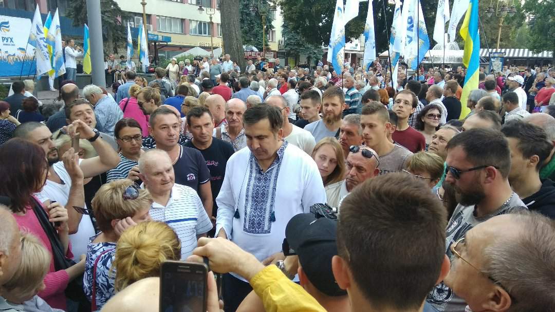 Після повернення в Україну екс-президент Грузії поїхав з туром по великих містах. На Вічевому майдані послухати політика прийшло кілька сотень прихильників.
